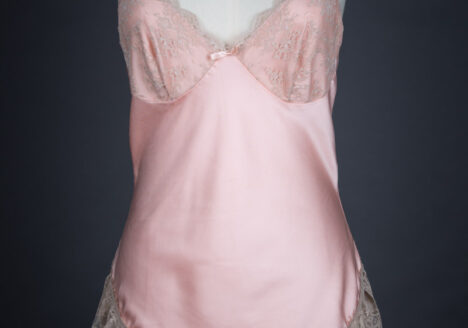 Satin & Lace High Leg Slip By Janet Reger Date: c. 1970s Origin: United Kingdom Fabric: Polyester satin, leavers lace Brand: Janet Reger   A high-cut slip in pale pink polyester satin. Ecru leavers lace overlays the bust with a scalloped edge neckline, with gathered lace trimming the skirt's hem. Satin bows trim the centre…