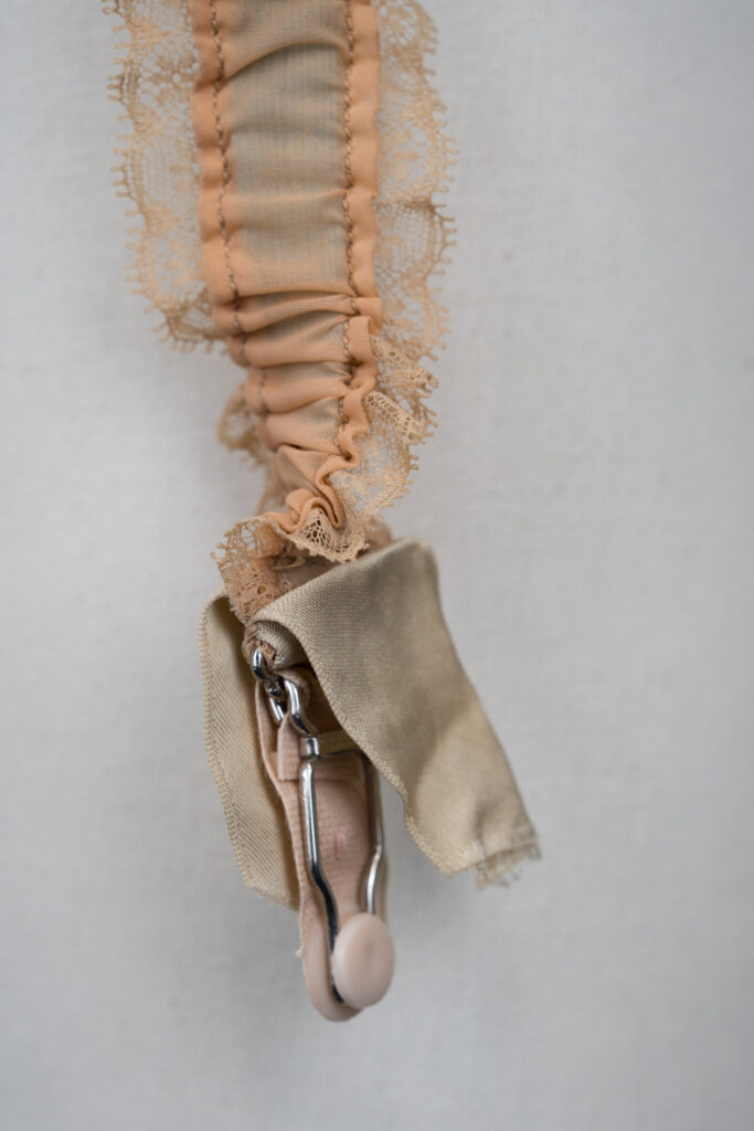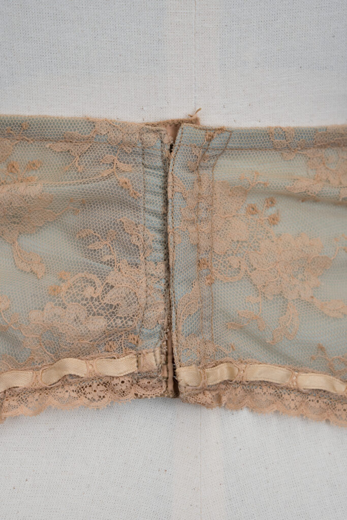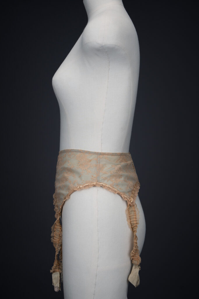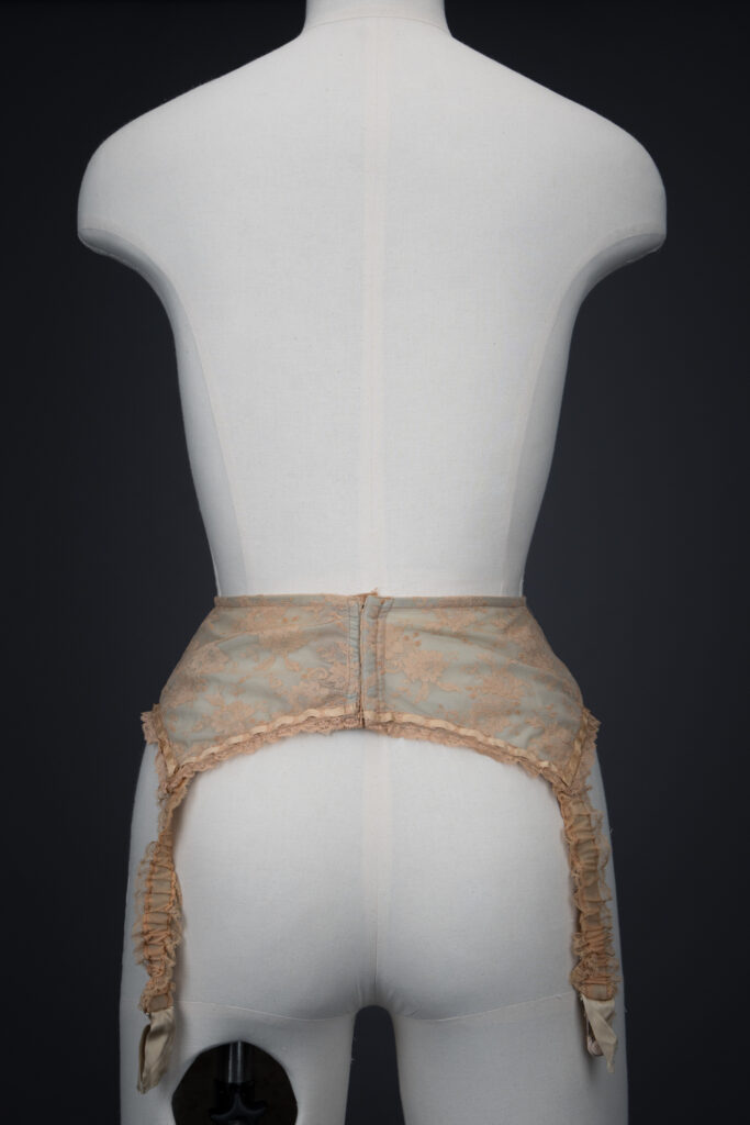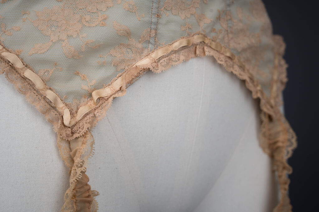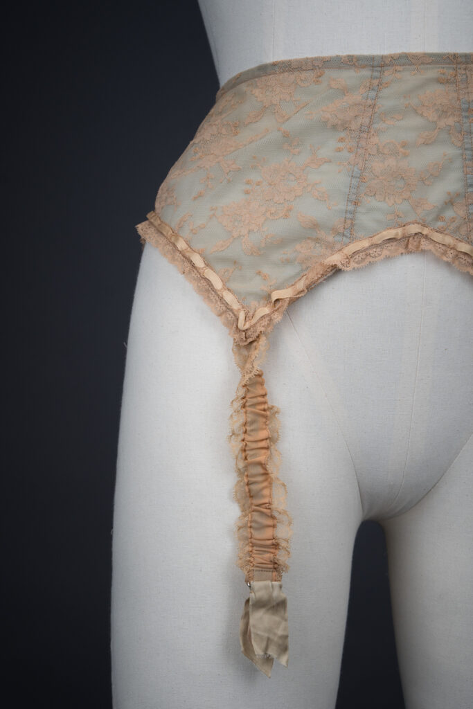 A suspender belt made of a machine-made Leavers lace, lined with woven nylon in an eau de nil shade. It is trimmed with a ribbon slot lace, threaded with a cream satin ribbon. The suspender straps are made of channels of beige woven nylon, edged with a lace trim. The channels are threaded with button hole elastic, which are adjustable on the interior of the garment with hidden buttons. The suspender belt fastens with hooks and eyes at the centre back. It has been altered, with a part of the centre back panel cut away, and the eye half of the fastening restitched somewhat crudely in what appears to be a home alteration. This style was originally made by the Marie Rose Lebigot brand for their USA-based stockist, Saks Fifth Avenue.