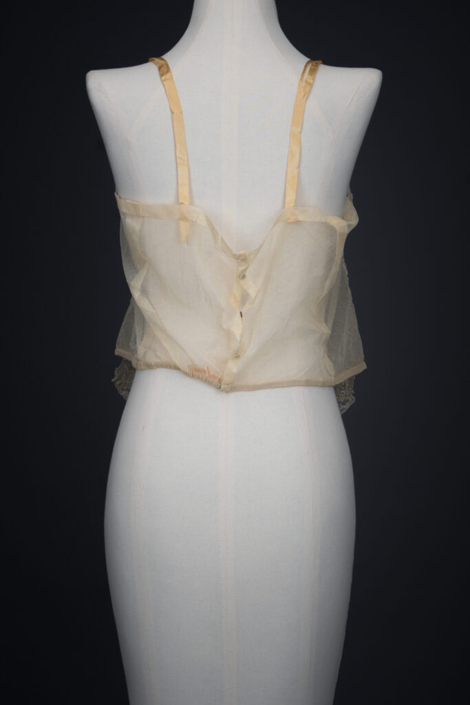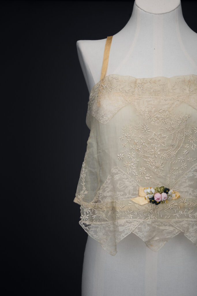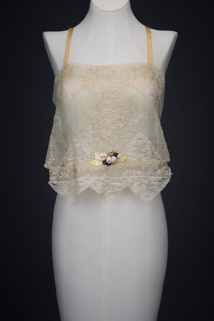 Embroidered Cotton Organdie Corset Cover With Machine Lace Trim & Silk Ribbonwork By Boué Soeurs, c. 1920s, France. The Underpinnings Museum. Photography by Tigz Rice.
