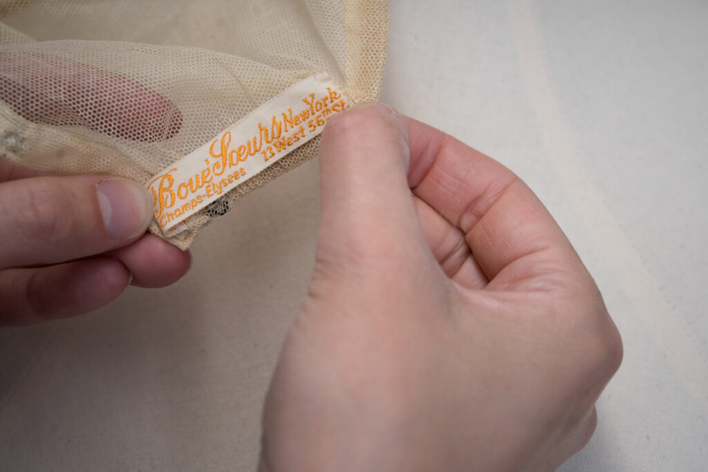 A channel is stitched at the waistline of the corset cover, containing a piece of elastic that would have originally cinched the garment in. The elastic has now perished and stretched out completely. The shoulder straps are made of a yellow, silk-satin ribbon. This silk was originally treated with metal salts to give it a more pleasing lustre and weight. However, as time passes, these salts begin to crystallise and cut through the protein-based silk fibres, resulting in a condition called ‘shatter’, wherein the fibres begin to disintegrate. This chemical reaction cannot be reversed.