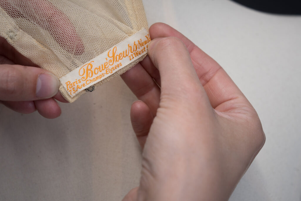 The corset cover has a very simple and angular silhouette, similar to this other Boué Soeurs corset cover within our collection. The interior label of the garment lists the address 73 Avenue Champs Elysées, a retail location that the brand opened in 1929.